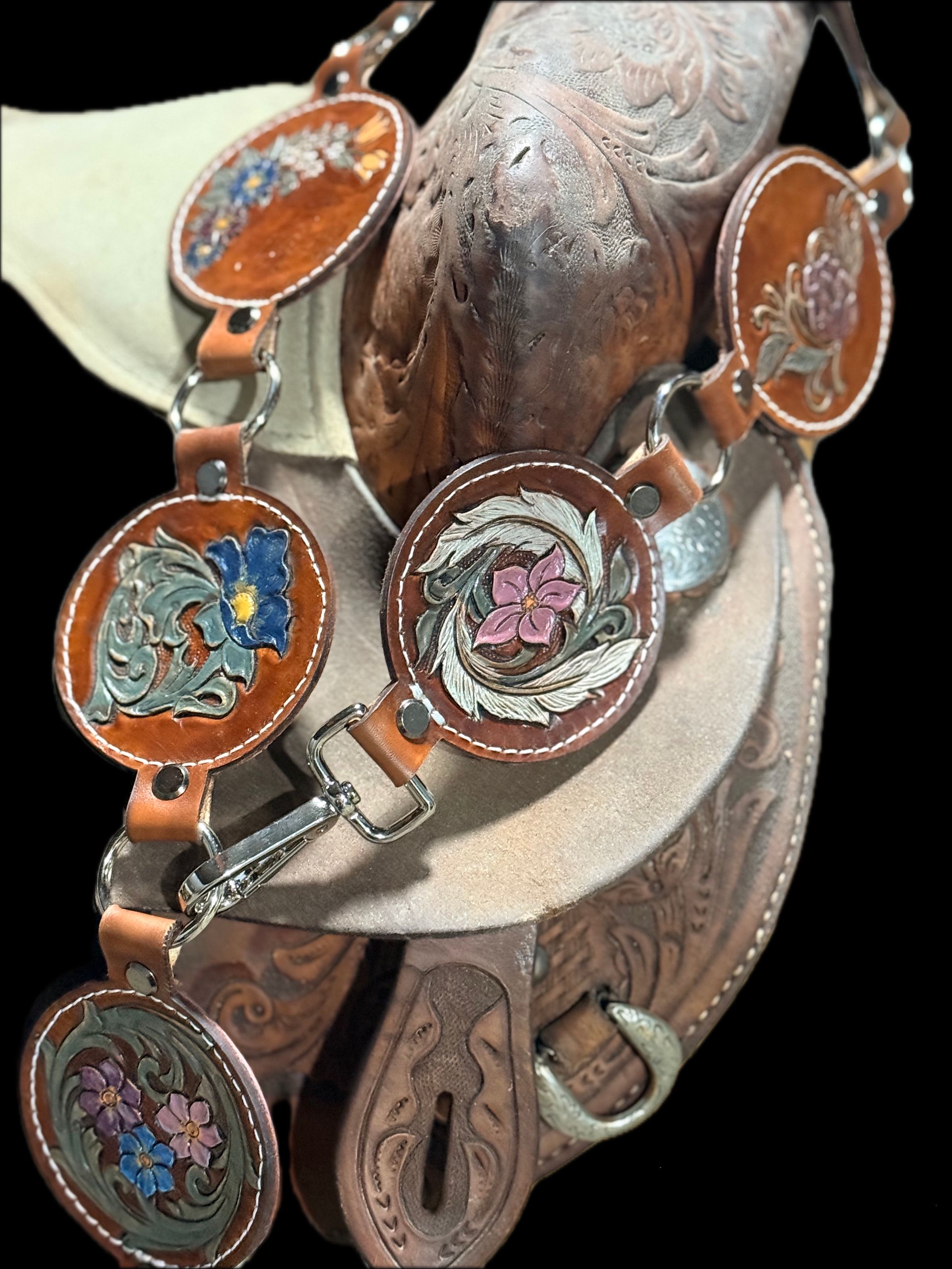 Prairie Bloom Leather Concho Belt – Hand Tooled Purple & Blue Floral